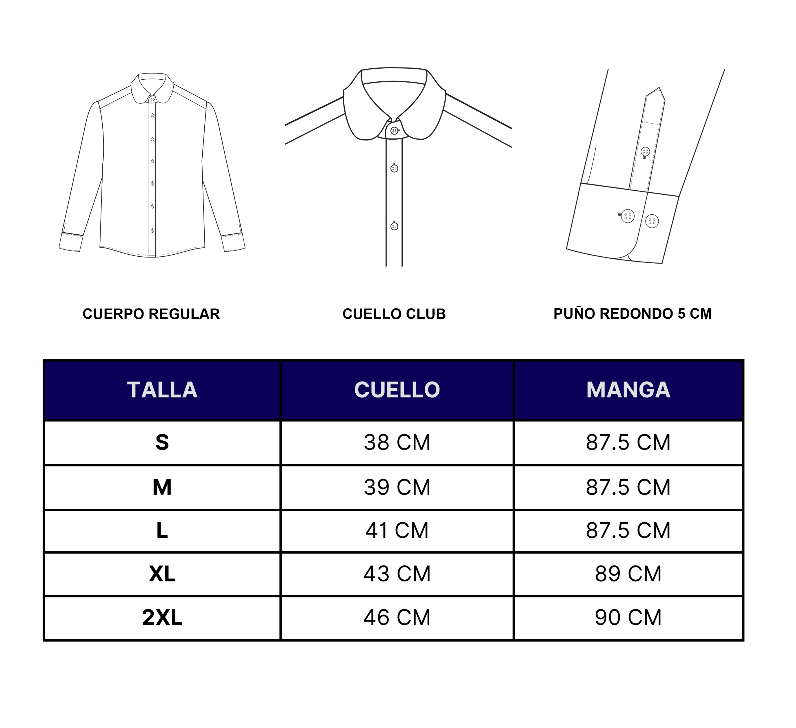 CAMISA CUELLO CLUB CLASICOCALCE REGULAR FIT.CUELLO Y PUÑO BLANCO.PUÑO REDONDO DE 5 CM.COMPOSICIÓN 60% ALGODÓN 40% POLIESTER